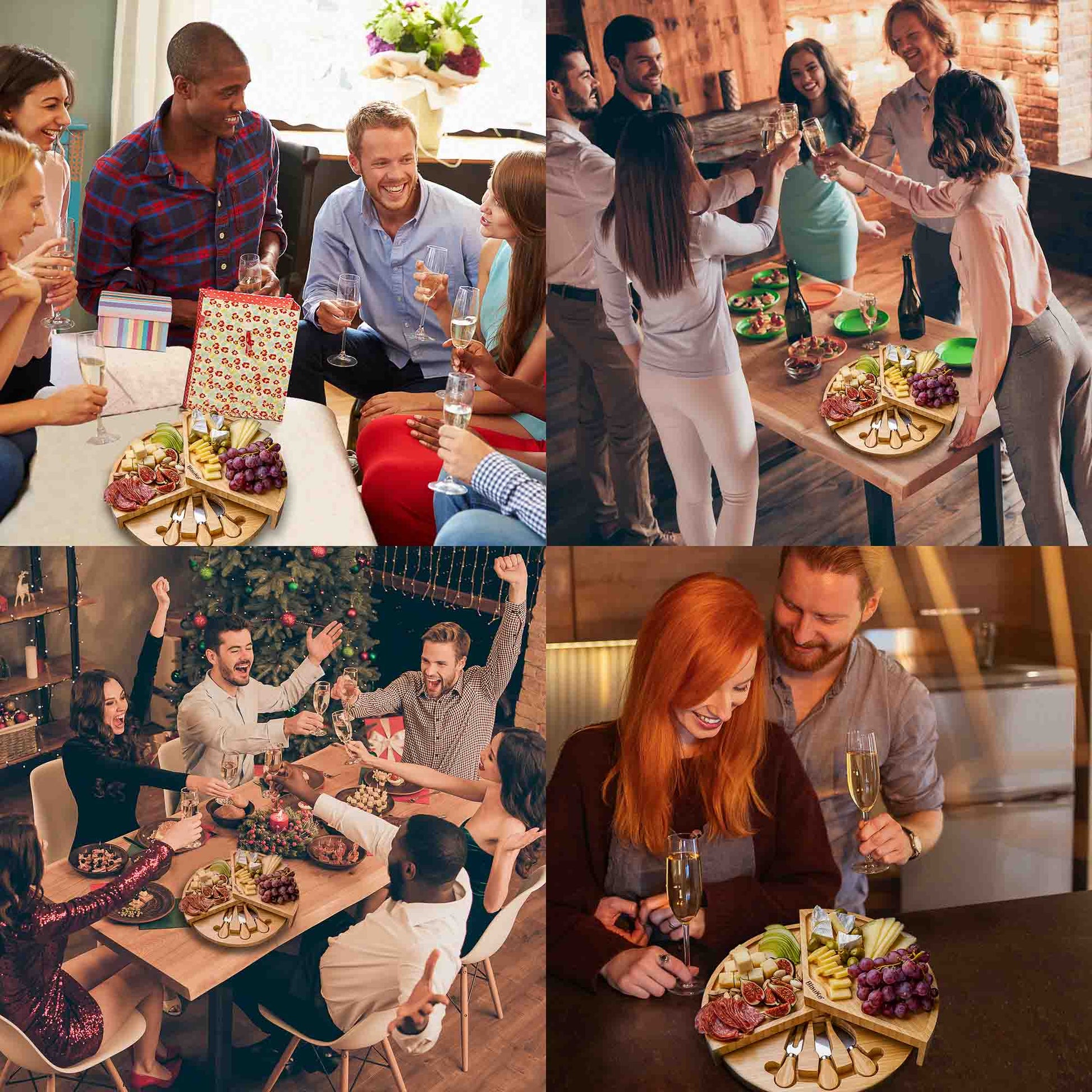 - This 14-inch round bamboo cheese board and knife set make a unique presentation that your guests won’t soon forget. It serves 2-3 people in style, and it's foldable for easy and convenient storage.